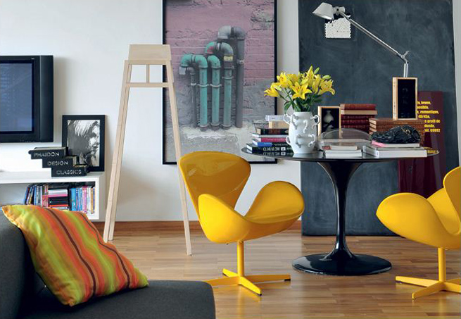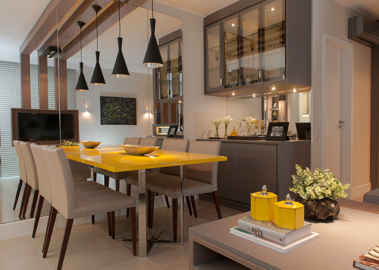 Para quem tem um perfil mais discreto, é interessante equilibrar o amarelo com tons neutros ou fechados, como o cinza e os amadeirados. Neste caso, o amarelo pode ser usado como destaque na decoração, seja em um objeto decorativo, um rack ou uma almofada.